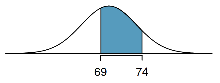 20-62 yaş erkeklerin boy dağılımı ortalaması 70 inç ve standart sapması 3.3 inç iken, rastgele seçilen bir erkeğin boyunun 69 inç ve 74 inç arasında olması ihtimali nedir?