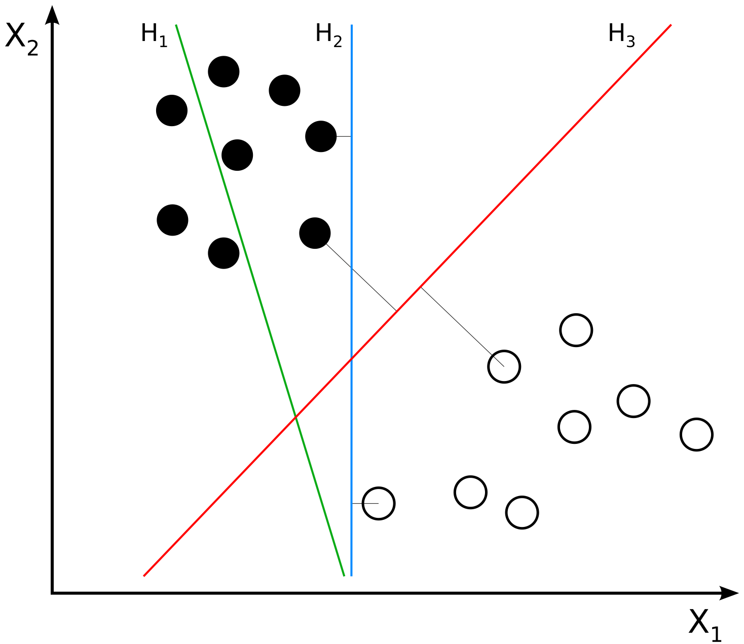 H1 does not separate the classes. H2 does, but only with a small margin. H3 separates them with the maximal margin. Source