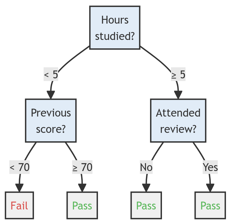 Decision Trees are a classification method that uses a tree-like model of decisions and their possible consequences. The algorithm learns a series of if-then-else decision rules that split the data based on feature values, creating a structure that resembles a flowchart. Each internal node represents a “test” on an attribute, each branch represents the outcome of the test, and each leaf node represents a class label or decision.